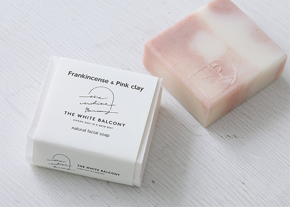 - 乾燥肌や老化肌のケアに使われるフランキンセンス精油と毛穴の汚れを優しくオフするピンククレイを少量使うことでほんのりピンクのマーブル模様のあるフェイスソープ。